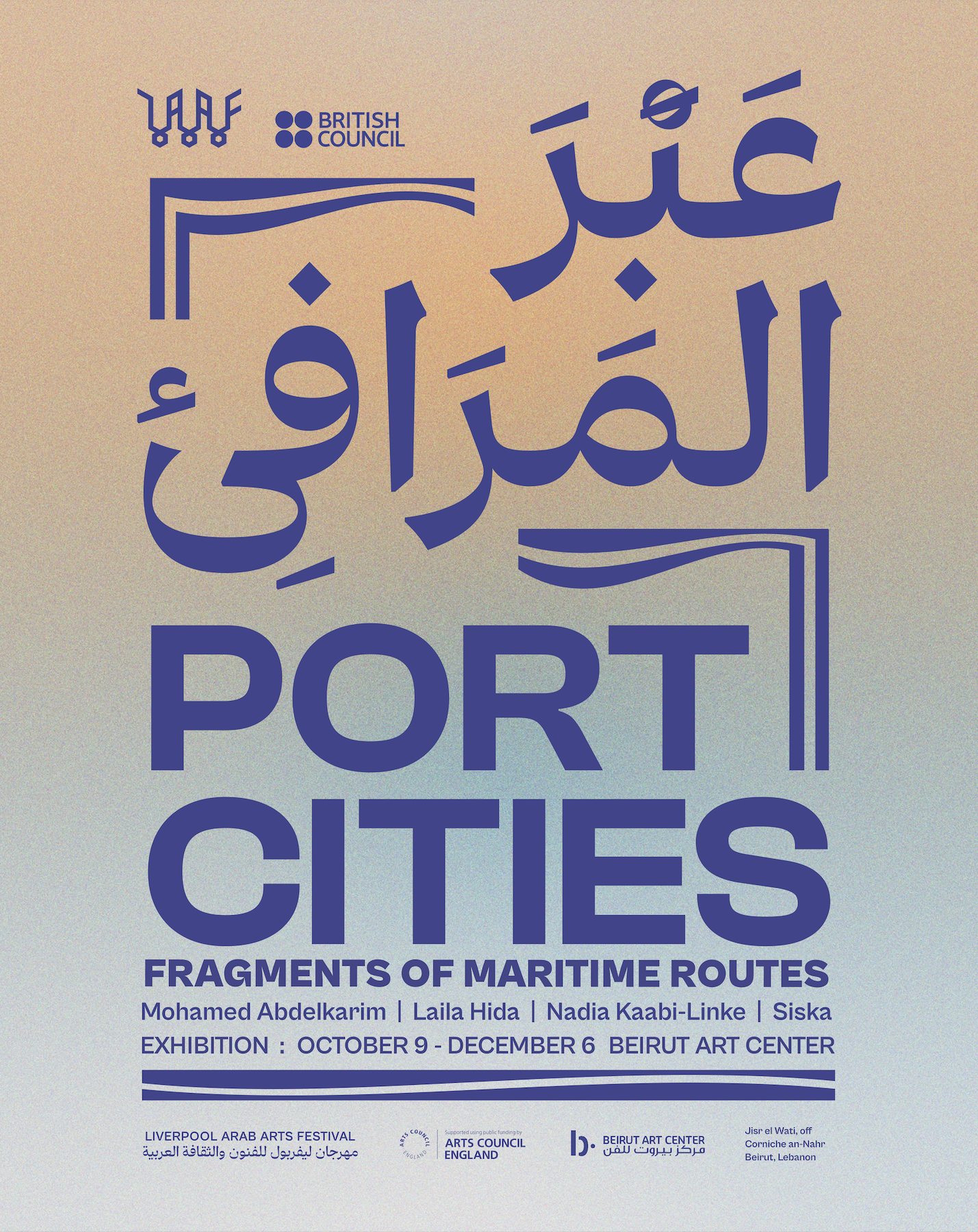 يجمع معرض عبر المرافئ أعمالًا جديدة للفنانين محمد عبد الكريم، ليلى حيدا، نادية كعبي-لينكي، وسيسكا. انطلق المشروع من إقامات فنية في ليفربول عام 2024، حيث تفاعل الفنانون مع البُنى التحتية البحرية وتواريخ التجارة والاستعباد والهجرة. عاد كلٌّ منهم بعد ذلك إلى شاطئه، في الإسكندرية، أو تونس، أو مراكش، أوبيروت، متسائلًا عمّا يعنيه العيش اليوم وسط رواسب تلك الموروثات.